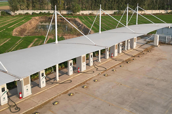 由于天津膜結(jié)構的自重輕受力好的特點,膜結(jié)構充電樁雨棚內(nèi)部不需要大量的鋼構支撐,設計師可以自由發(fā)揮去設計它的運用空間,大膽的設計藝術風十足的現(xiàn)代化建筑。